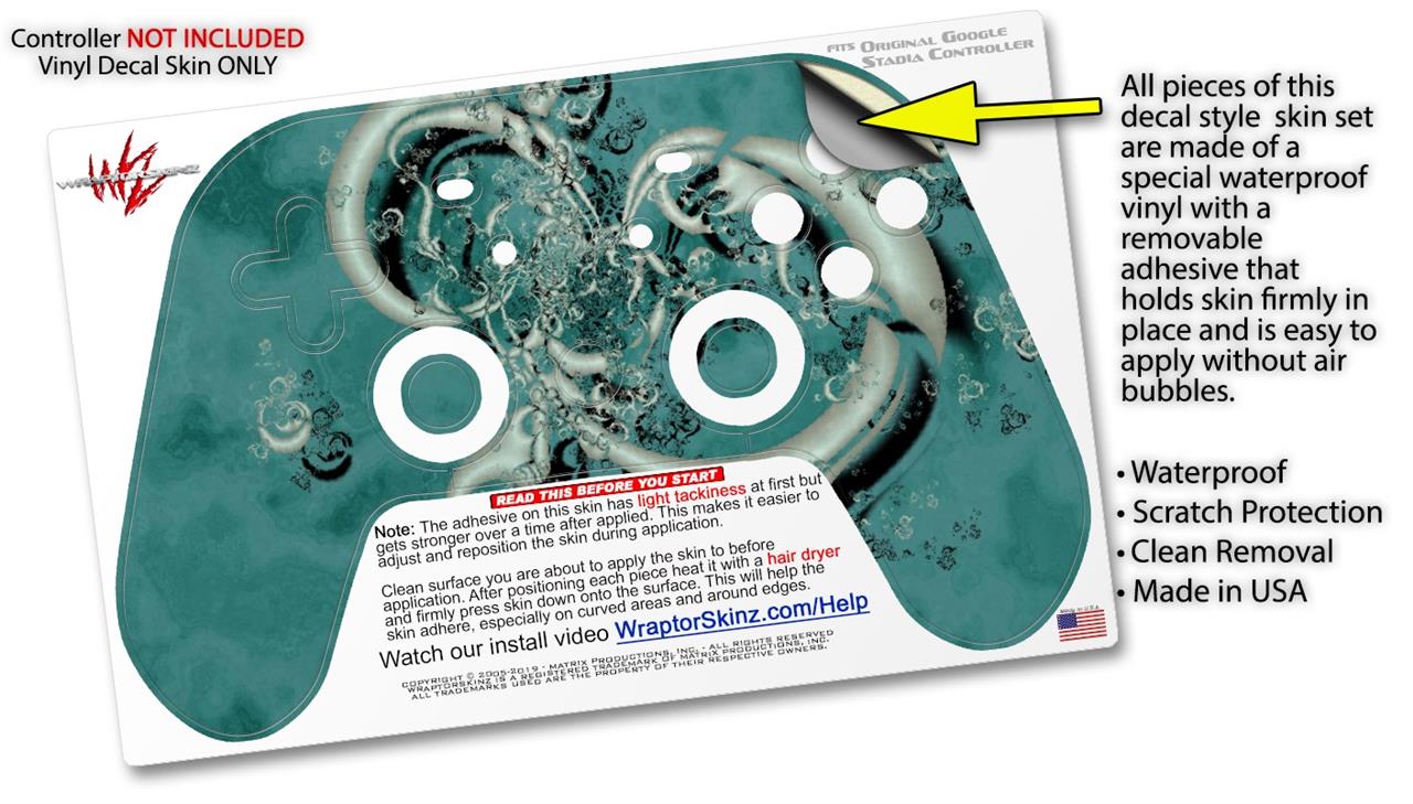 This product is in no way affiliated with or endorsed by Google. WraptorSkinz® skin wraps work with the Original Google Stadia version 1 Controller. Printed using superb photo quality designs and vibrant colors printed with special fade resistant inks that last even in direct sun for years. WraptorSkinz are a composite of two layers of commercial grade materials. The bottom layer is a soft, flexible vinyl with a special removable adhesive that is easily positioned, applied without air bubbles. Next, we print the bottom layer with UV protected, fade resistant inks that deliver superb photo quality designs in vibrant colors. Finally, we bond a professional grade laminate over the entire skin adding a glossy protective finish.