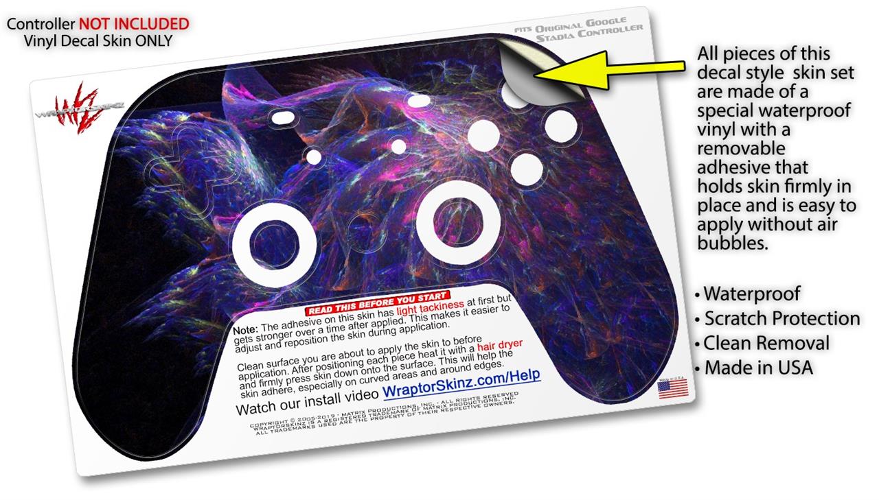 This product is in no way affiliated with or endorsed by Google. WraptorSkinz® skin wraps work with the Original Google Stadia version 1 Controller. Printed using superb photo quality designs and vibrant colors printed with special fade resistant inks that last even in direct sun for years. WraptorSkinz are a composite of two layers of commercial grade materials. The bottom layer is a soft, flexible vinyl with a special removable adhesive that is easily positioned, applied without air bubbles. Next, we print the bottom layer with UV protected, fade resistant inks that deliver superb photo quality designs in vibrant colors. Finally, we bond a professional grade laminate over the entire skin adding a glossy protective finish.
