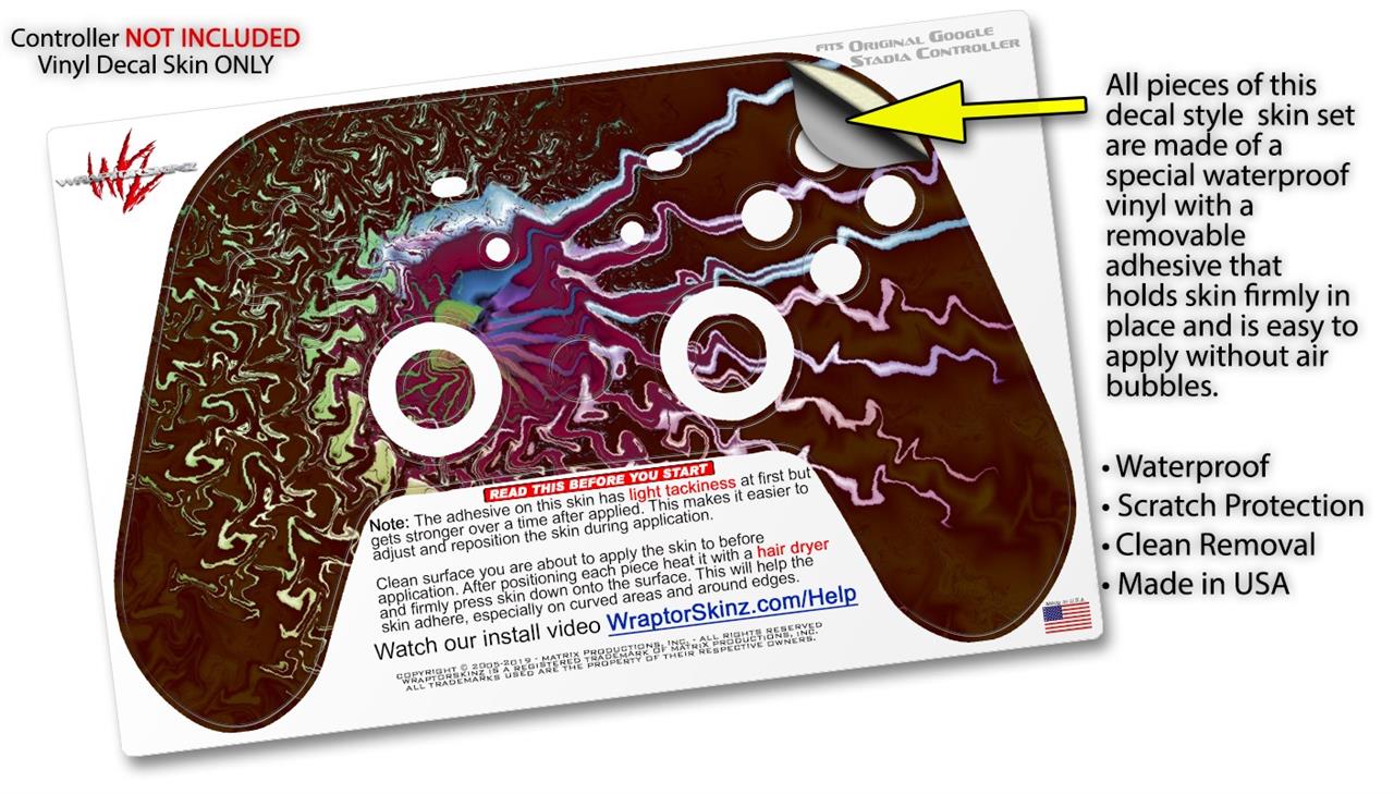 This product is in no way affiliated with or endorsed by Google. WraptorSkinz® skin wraps work with the Original Google Stadia version 1 Controller. Printed using superb photo quality designs and vibrant colors printed with special fade resistant inks that last even in direct sun for years. WraptorSkinz are a composite of two layers of commercial grade materials. The bottom layer is a soft, flexible vinyl with a special removable adhesive that is easily positioned, applied without air bubbles. Next, we print the bottom layer with UV protected, fade resistant inks that deliver superb photo quality designs in vibrant colors. Finally, we bond a professional grade laminate over the entire skin adding a glossy protective finish.