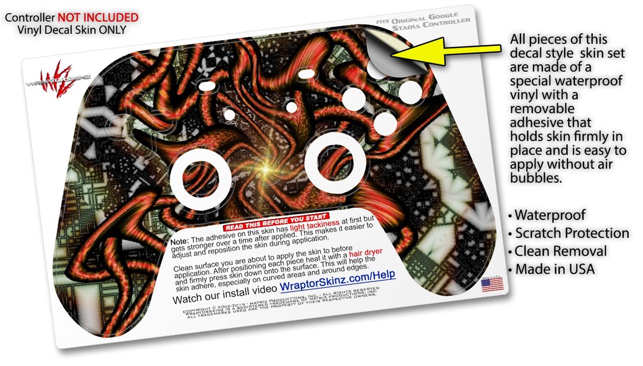 This product is in no way affiliated with or endorsed by Google. WraptorSkinz® skin wraps work with the Original Google Stadia version 1 Controller. Printed using superb photo quality designs and vibrant colors printed with special fade resistant inks that last even in direct sun for years. WraptorSkinz are a composite of two layers of commercial grade materials. The bottom layer is a soft, flexible vinyl with a special removable adhesive that is easily positioned, applied without air bubbles. Next, we print the bottom layer with UV protected, fade resistant inks that deliver superb photo quality designs in vibrant colors. Finally, we bond a professional grade laminate over the entire skin adding a glossy protective finish.
