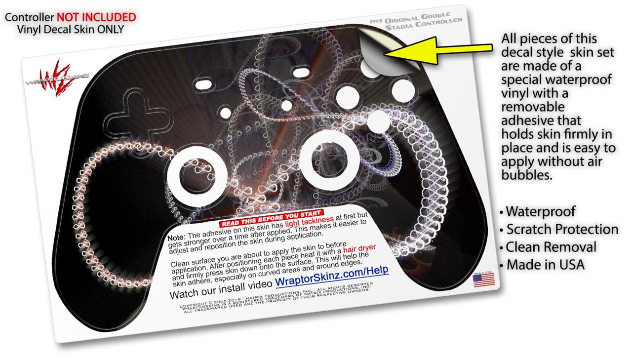 This product is in no way affiliated with or endorsed by Google. WraptorSkinz® skin wraps work with the Original Google Stadia version 1 Controller. Printed using superb photo quality designs and vibrant colors printed with special fade resistant inks that last even in direct sun for years. WraptorSkinz are a composite of two layers of commercial grade materials. The bottom layer is a soft, flexible vinyl with a special removable adhesive that is easily positioned, applied without air bubbles. Next, we print the bottom layer with UV protected, fade resistant inks that deliver superb photo quality designs in vibrant colors. Finally, we bond a professional grade laminate over the entire skin adding a glossy protective finish.