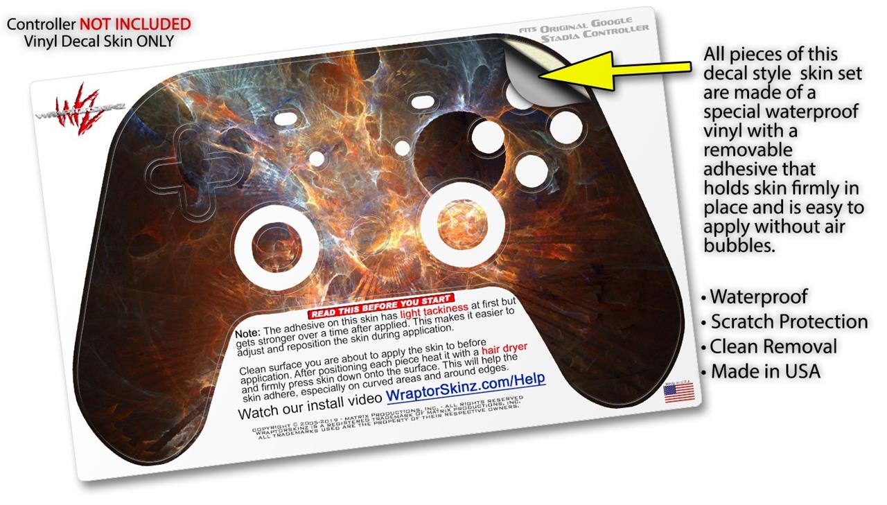 This product is in no way affiliated with or endorsed by Google. WraptorSkinz® skin wraps work with the Original Google Stadia version 1 Controller. Printed using superb photo quality designs and vibrant colors printed with special fade resistant inks that last even in direct sun for years. WraptorSkinz are a composite of two layers of commercial grade materials. The bottom layer is a soft, flexible vinyl with a special removable adhesive that is easily positioned, applied without air bubbles. Next, we print the bottom layer with UV protected, fade resistant inks that deliver superb photo quality designs in vibrant colors. Finally, we bond a professional grade laminate over the entire skin adding a glossy protective finish.