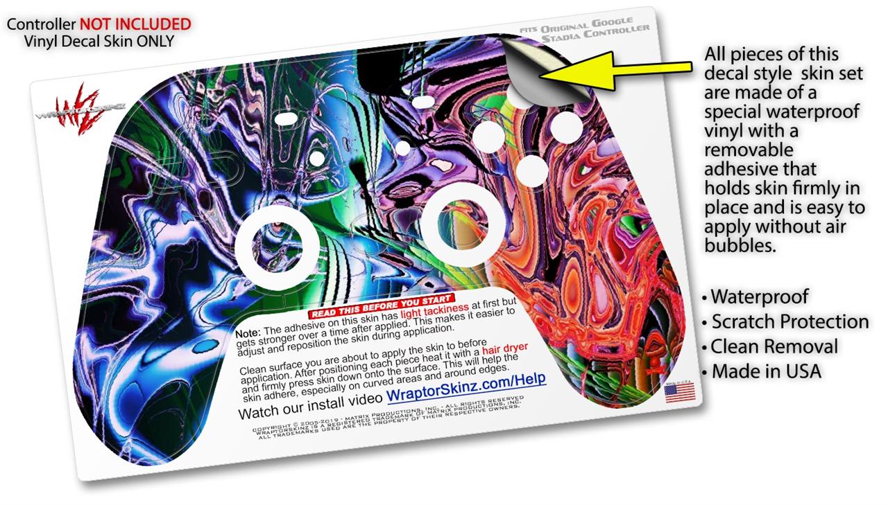 This product is in no way affiliated with or endorsed by Google. WraptorSkinz® skin wraps work with the Original Google Stadia version 1 Controller. Printed using superb photo quality designs and vibrant colors printed with special fade resistant inks that last even in direct sun for years. WraptorSkinz are a composite of two layers of commercial grade materials. The bottom layer is a soft, flexible vinyl with a special removable adhesive that is easily positioned, applied without air bubbles. Next, we print the bottom layer with UV protected, fade resistant inks that deliver superb photo quality designs in vibrant colors. Finally, we bond a professional grade laminate over the entire skin adding a glossy protective finish.