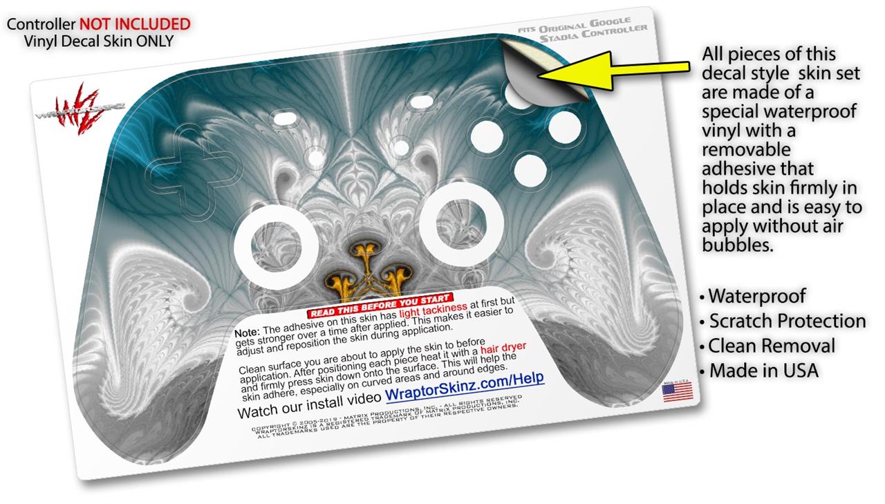 This product is in no way affiliated with or endorsed by Google. WraptorSkinz® skin wraps work with the Original Google Stadia version 1 Controller. Printed using superb photo quality designs and vibrant colors printed with special fade resistant inks that last even in direct sun for years. WraptorSkinz are a composite of two layers of commercial grade materials. The bottom layer is a soft, flexible vinyl with a special removable adhesive that is easily positioned, applied without air bubbles. Next, we print the bottom layer with UV protected, fade resistant inks that deliver superb photo quality designs in vibrant colors. Finally, we bond a professional grade laminate over the entire skin adding a glossy protective finish.