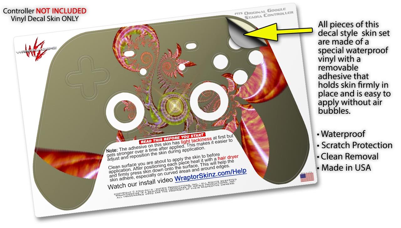 This product is in no way affiliated with or endorsed by Google. WraptorSkinz® skin wraps work with the Original Google Stadia version 1 Controller. Printed using superb photo quality designs and vibrant colors printed with special fade resistant inks that last even in direct sun for years. WraptorSkinz are a composite of two layers of commercial grade materials. The bottom layer is a soft, flexible vinyl with a special removable adhesive that is easily positioned, applied without air bubbles. Next, we print the bottom layer with UV protected, fade resistant inks that deliver superb photo quality designs in vibrant colors. Finally, we bond a professional grade laminate over the entire skin adding a glossy protective finish.