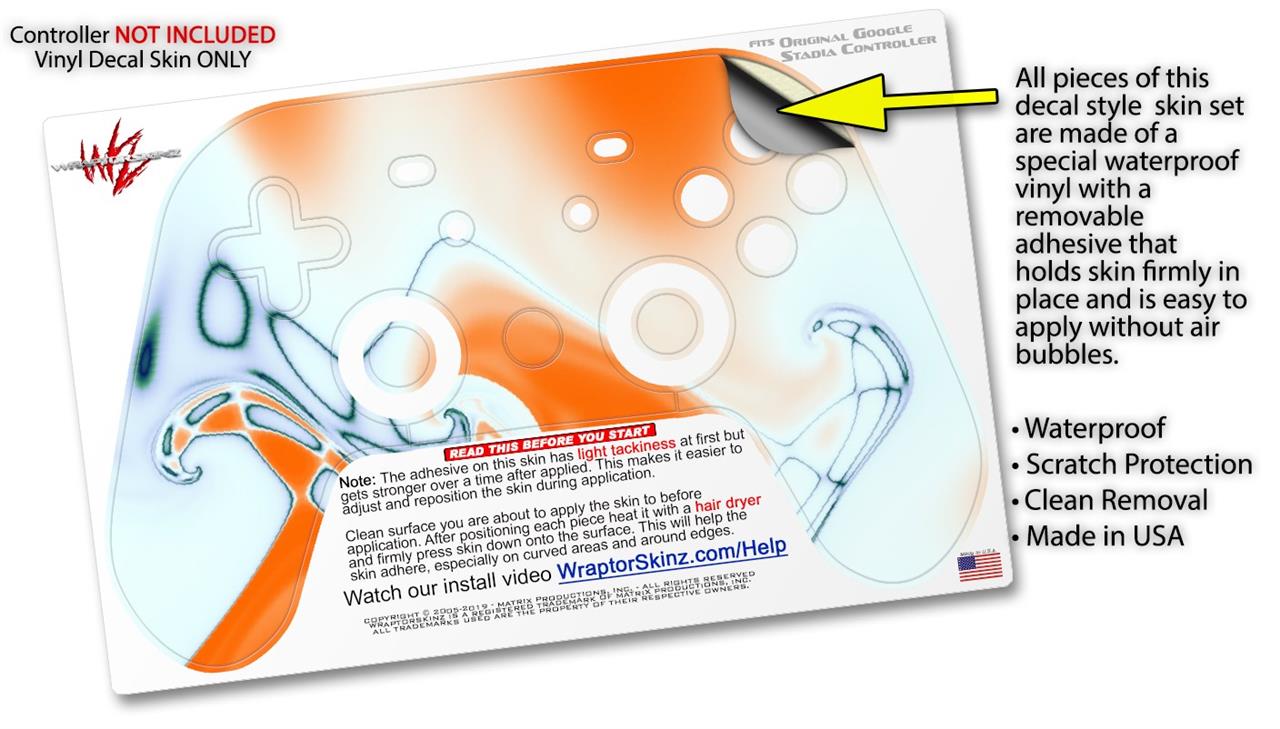 This product is in no way affiliated with or endorsed by Google. WraptorSkinz® skin wraps work with the Original Google Stadia version 1 Controller. Printed using superb photo quality designs and vibrant colors printed with special fade resistant inks that last even in direct sun for years. WraptorSkinz are a composite of two layers of commercial grade materials. The bottom layer is a soft, flexible vinyl with a special removable adhesive that is easily positioned, applied without air bubbles. Next, we print the bottom layer with UV protected, fade resistant inks that deliver superb photo quality designs in vibrant colors. Finally, we bond a professional grade laminate over the entire skin adding a glossy protective finish.