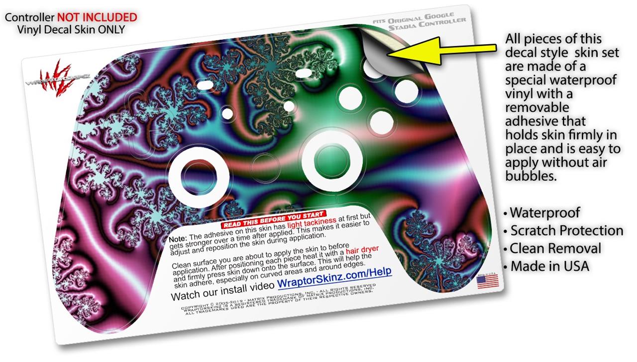 This product is in no way affiliated with or endorsed by Google. WraptorSkinz® skin wraps work with the Original Google Stadia version 1 Controller. Printed using superb photo quality designs and vibrant colors printed with special fade resistant inks that last even in direct sun for years. WraptorSkinz are a composite of two layers of commercial grade materials. The bottom layer is a soft, flexible vinyl with a special removable adhesive that is easily positioned, applied without air bubbles. Next, we print the bottom layer with UV protected, fade resistant inks that deliver superb photo quality designs in vibrant colors. Finally, we bond a professional grade laminate over the entire skin adding a glossy protective finish.