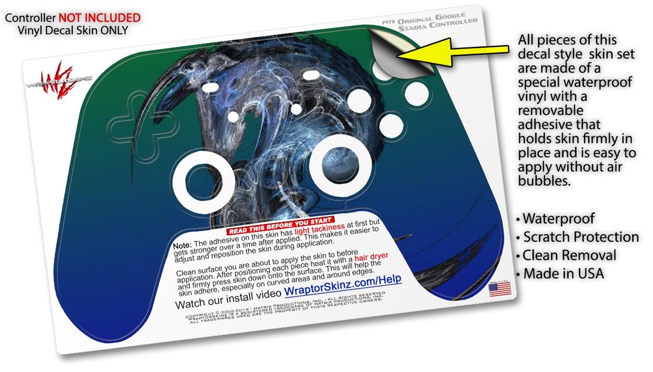 This product is in no way affiliated with or endorsed by Google. WraptorSkinz® skin wraps work with the Original Google Stadia version 1 Controller. Printed using superb photo quality designs and vibrant colors printed with special fade resistant inks that last even in direct sun for years. WraptorSkinz are a composite of two layers of commercial grade materials. The bottom layer is a soft, flexible vinyl with a special removable adhesive that is easily positioned, applied without air bubbles. Next, we print the bottom layer with UV protected, fade resistant inks that deliver superb photo quality designs in vibrant colors. Finally, we bond a professional grade laminate over the entire skin adding a glossy protective finish.