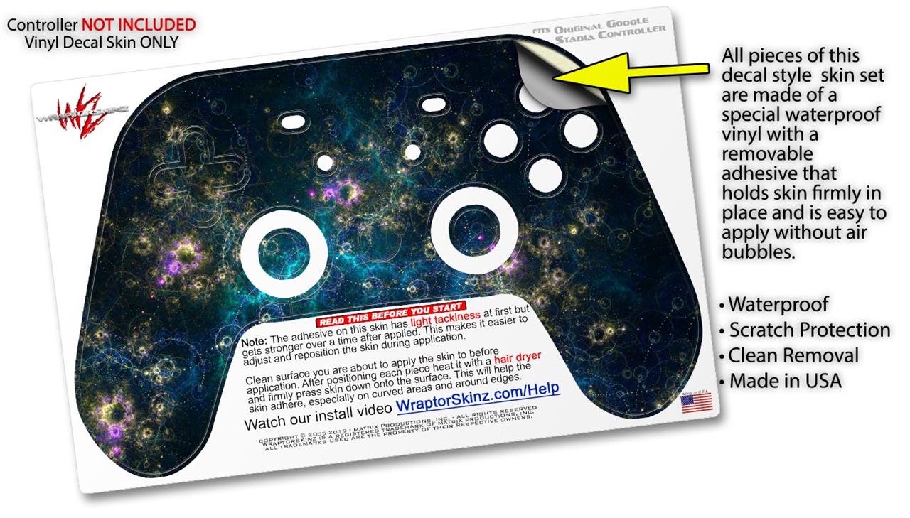 This product is in no way affiliated with or endorsed by Google. WraptorSkinz® skin wraps work with the Original Google Stadia version 1 Controller. Printed using superb photo quality designs and vibrant colors printed with special fade resistant inks that last even in direct sun for years. WraptorSkinz are a composite of two layers of commercial grade materials. The bottom layer is a soft, flexible vinyl with a special removable adhesive that is easily positioned, applied without air bubbles. Next, we print the bottom layer with UV protected, fade resistant inks that deliver superb photo quality designs in vibrant colors. Finally, we bond a professional grade laminate over the entire skin adding a glossy protective finish.