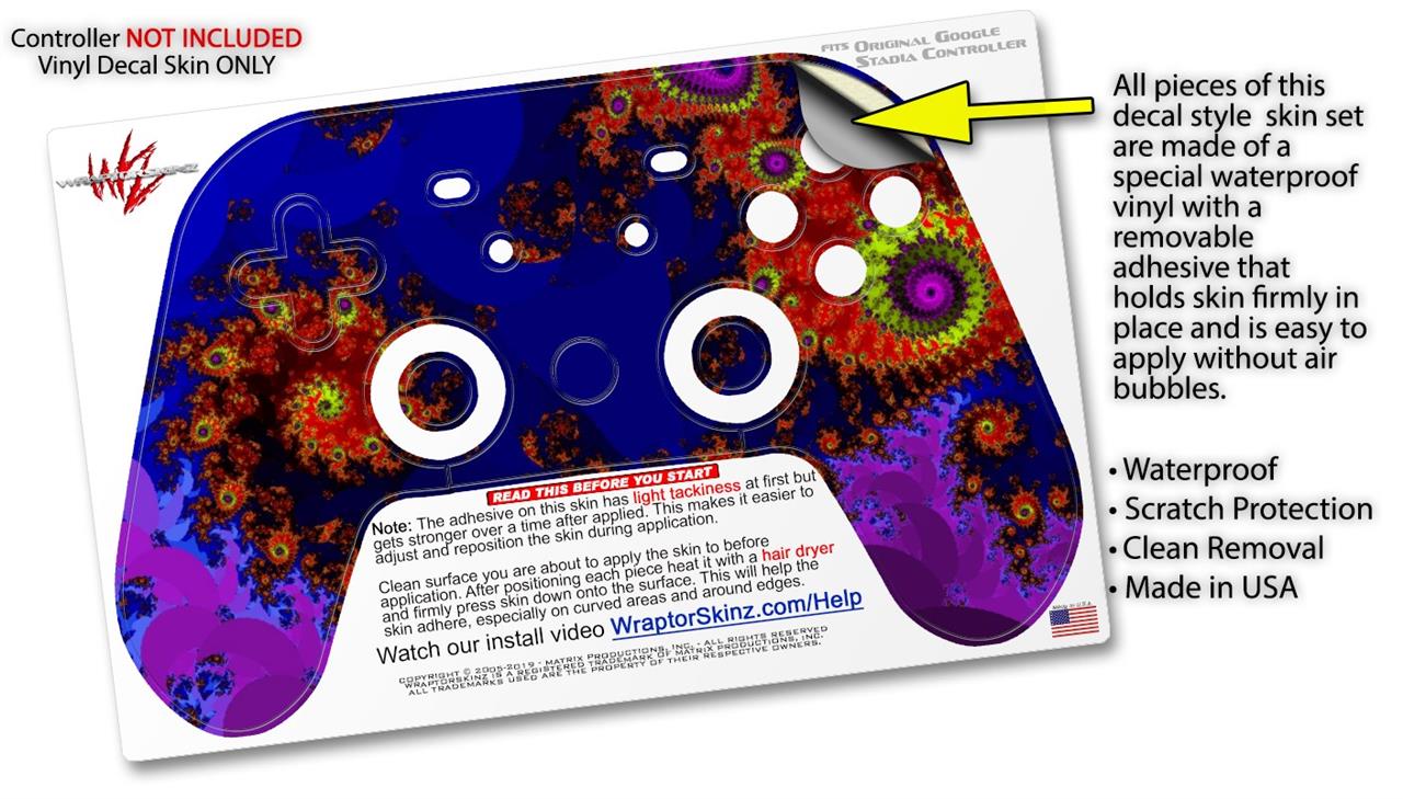 This product is in no way affiliated with or endorsed by Google. WraptorSkinz® skin wraps work with the Original Google Stadia version 1 Controller. Printed using superb photo quality designs and vibrant colors printed with special fade resistant inks that last even in direct sun for years. WraptorSkinz are a composite of two layers of commercial grade materials. The bottom layer is a soft, flexible vinyl with a special removable adhesive that is easily positioned, applied without air bubbles. Next, we print the bottom layer with UV protected, fade resistant inks that deliver superb photo quality designs in vibrant colors. Finally, we bond a professional grade laminate over the entire skin adding a glossy protective finish.