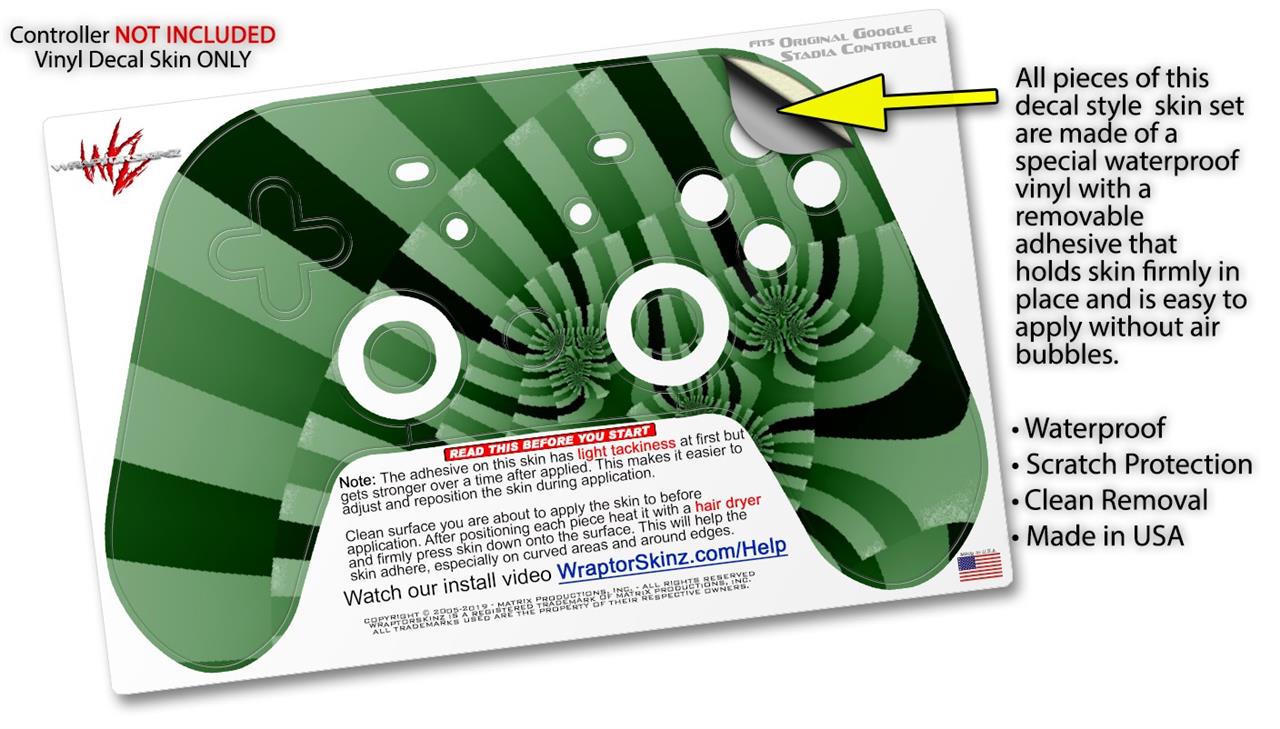 This product is in no way affiliated with or endorsed by Google. WraptorSkinz® skin wraps work with the Original Google Stadia version 1 Controller. Printed using superb photo quality designs and vibrant colors printed with special fade resistant inks that last even in direct sun for years. WraptorSkinz are a composite of two layers of commercial grade materials. The bottom layer is a soft, flexible vinyl with a special removable adhesive that is easily positioned, applied without air bubbles. Next, we print the bottom layer with UV protected, fade resistant inks that deliver superb photo quality designs in vibrant colors. Finally, we bond a professional grade laminate over the entire skin adding a glossy protective finish.