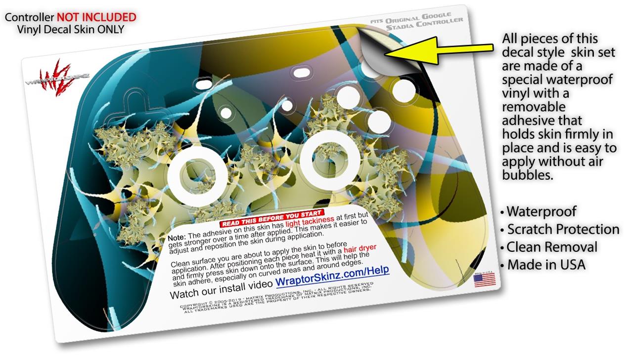 This product is in no way affiliated with or endorsed by Google. WraptorSkinz® skin wraps work with the Original Google Stadia version 1 Controller. Printed using superb photo quality designs and vibrant colors printed with special fade resistant inks that last even in direct sun for years. WraptorSkinz are a composite of two layers of commercial grade materials. The bottom layer is a soft, flexible vinyl with a special removable adhesive that is easily positioned, applied without air bubbles. Next, we print the bottom layer with UV protected, fade resistant inks that deliver superb photo quality designs in vibrant colors. Finally, we bond a professional grade laminate over the entire skin adding a glossy protective finish.