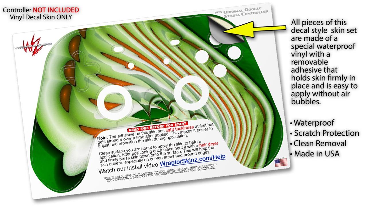 This product is in no way affiliated with or endorsed by Google. WraptorSkinz® skin wraps work with the Original Google Stadia version 1 Controller. Printed using superb photo quality designs and vibrant colors printed with special fade resistant inks that last even in direct sun for years. WraptorSkinz are a composite of two layers of commercial grade materials. The bottom layer is a soft, flexible vinyl with a special removable adhesive that is easily positioned, applied without air bubbles. Next, we print the bottom layer with UV protected, fade resistant inks that deliver superb photo quality designs in vibrant colors. Finally, we bond a professional grade laminate over the entire skin adding a glossy protective finish.