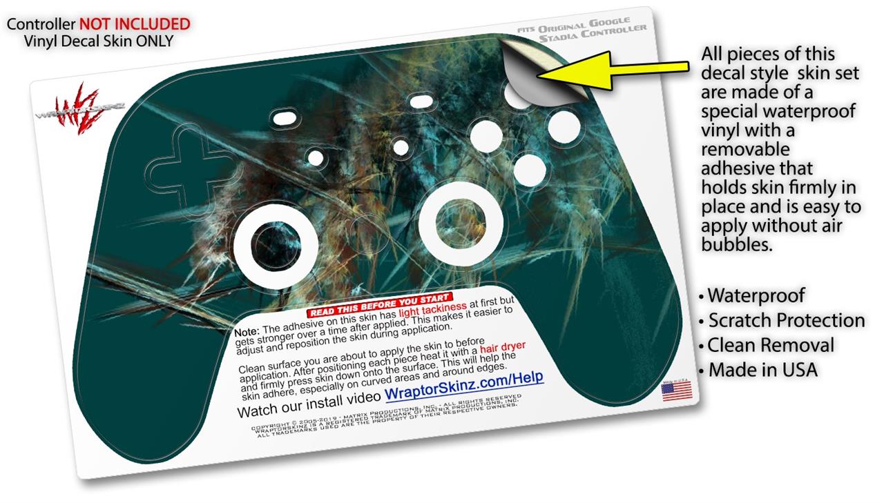 This product is in no way affiliated with or endorsed by Google. WraptorSkinz® skin wraps work with the Original Google Stadia version 1 Controller. Printed using superb photo quality designs and vibrant colors printed with special fade resistant inks that last even in direct sun for years. WraptorSkinz are a composite of two layers of commercial grade materials. The bottom layer is a soft, flexible vinyl with a special removable adhesive that is easily positioned, applied without air bubbles. Next, we print the bottom layer with UV protected, fade resistant inks that deliver superb photo quality designs in vibrant colors. Finally, we bond a professional grade laminate over the entire skin adding a glossy protective finish.