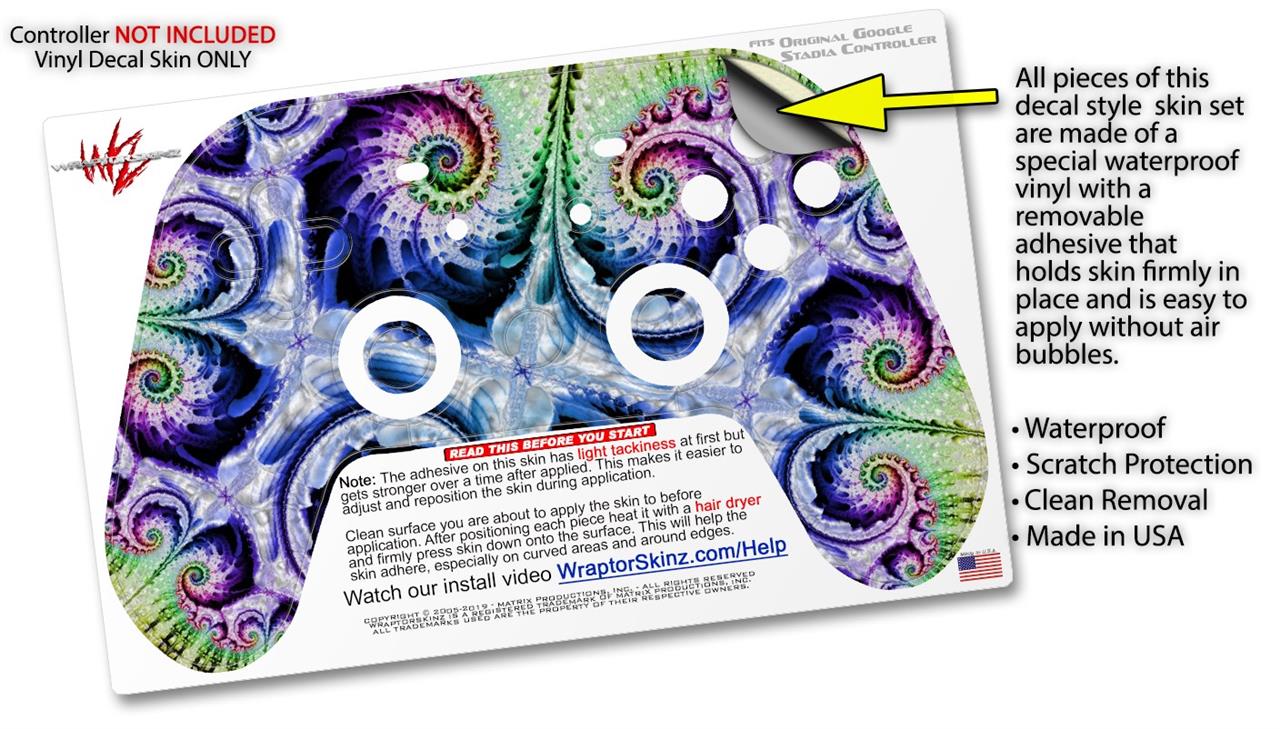 This product is in no way affiliated with or endorsed by Google. WraptorSkinz® skin wraps work with the Original Google Stadia version 1 Controller. Printed using superb photo quality designs and vibrant colors printed with special fade resistant inks that last even in direct sun for years. WraptorSkinz are a composite of two layers of commercial grade materials. The bottom layer is a soft, flexible vinyl with a special removable adhesive that is easily positioned, applied without air bubbles. Next, we print the bottom layer with UV protected, fade resistant inks that deliver superb photo quality designs in vibrant colors. Finally, we bond a professional grade laminate over the entire skin adding a glossy protective finish.