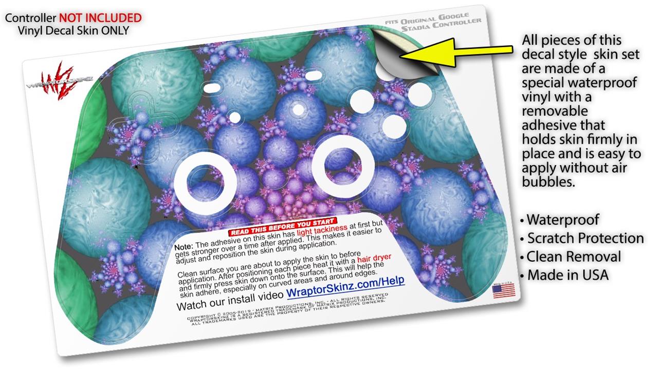 This product is in no way affiliated with or endorsed by Google. WraptorSkinz® skin wraps work with the Original Google Stadia version 1 Controller. Printed using superb photo quality designs and vibrant colors printed with special fade resistant inks that last even in direct sun for years. WraptorSkinz are a composite of two layers of commercial grade materials. The bottom layer is a soft, flexible vinyl with a special removable adhesive that is easily positioned, applied without air bubbles. Next, we print the bottom layer with UV protected, fade resistant inks that deliver superb photo quality designs in vibrant colors. Finally, we bond a professional grade laminate over the entire skin adding a glossy protective finish.