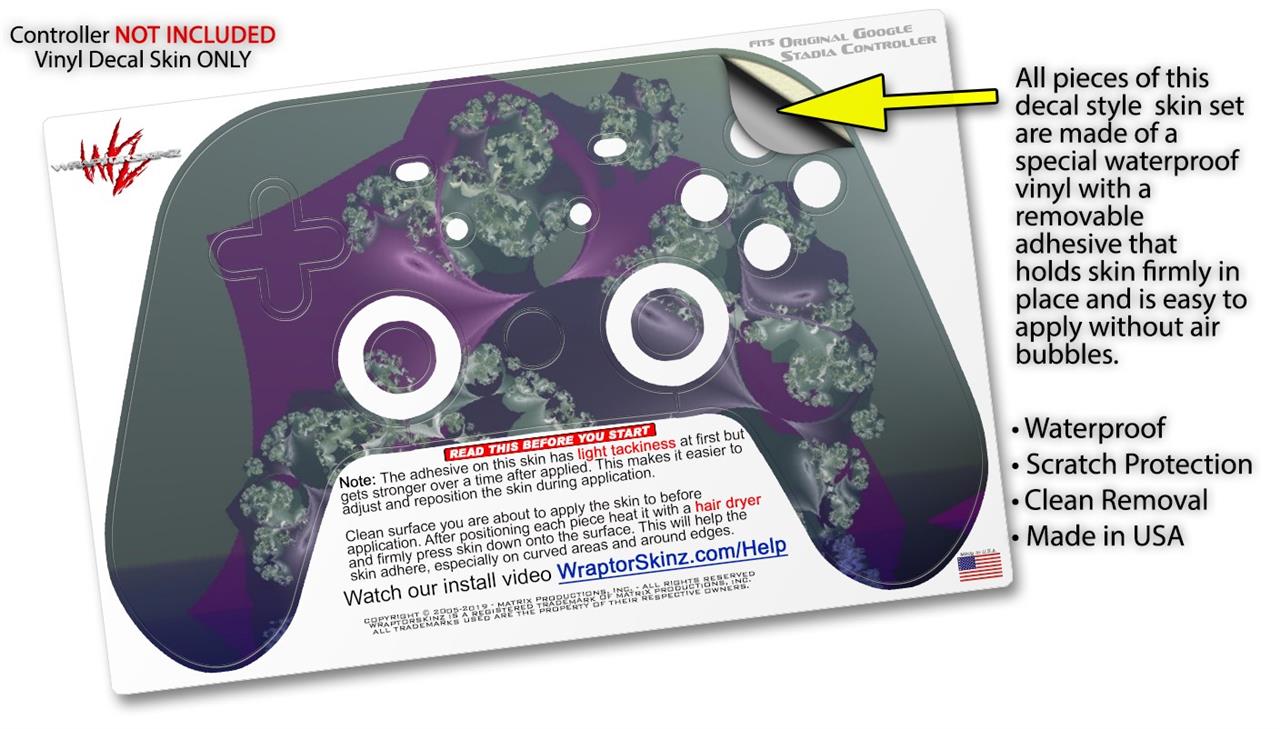 This product is in no way affiliated with or endorsed by Google. WraptorSkinz® skin wraps work with the Original Google Stadia version 1 Controller. Printed using superb photo quality designs and vibrant colors printed with special fade resistant inks that last even in direct sun for years. WraptorSkinz are a composite of two layers of commercial grade materials. The bottom layer is a soft, flexible vinyl with a special removable adhesive that is easily positioned, applied without air bubbles. Next, we print the bottom layer with UV protected, fade resistant inks that deliver superb photo quality designs in vibrant colors. Finally, we bond a professional grade laminate over the entire skin adding a glossy protective finish.