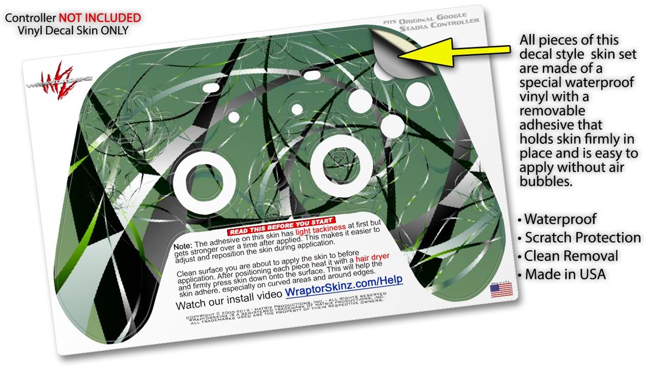This product is in no way affiliated with or endorsed by Google. WraptorSkinz® skin wraps work with the Original Google Stadia version 1 Controller. Printed using superb photo quality designs and vibrant colors printed with special fade resistant inks that last even in direct sun for years. WraptorSkinz are a composite of two layers of commercial grade materials. The bottom layer is a soft, flexible vinyl with a special removable adhesive that is easily positioned, applied without air bubbles. Next, we print the bottom layer with UV protected, fade resistant inks that deliver superb photo quality designs in vibrant colors. Finally, we bond a professional grade laminate over the entire skin adding a glossy protective finish.