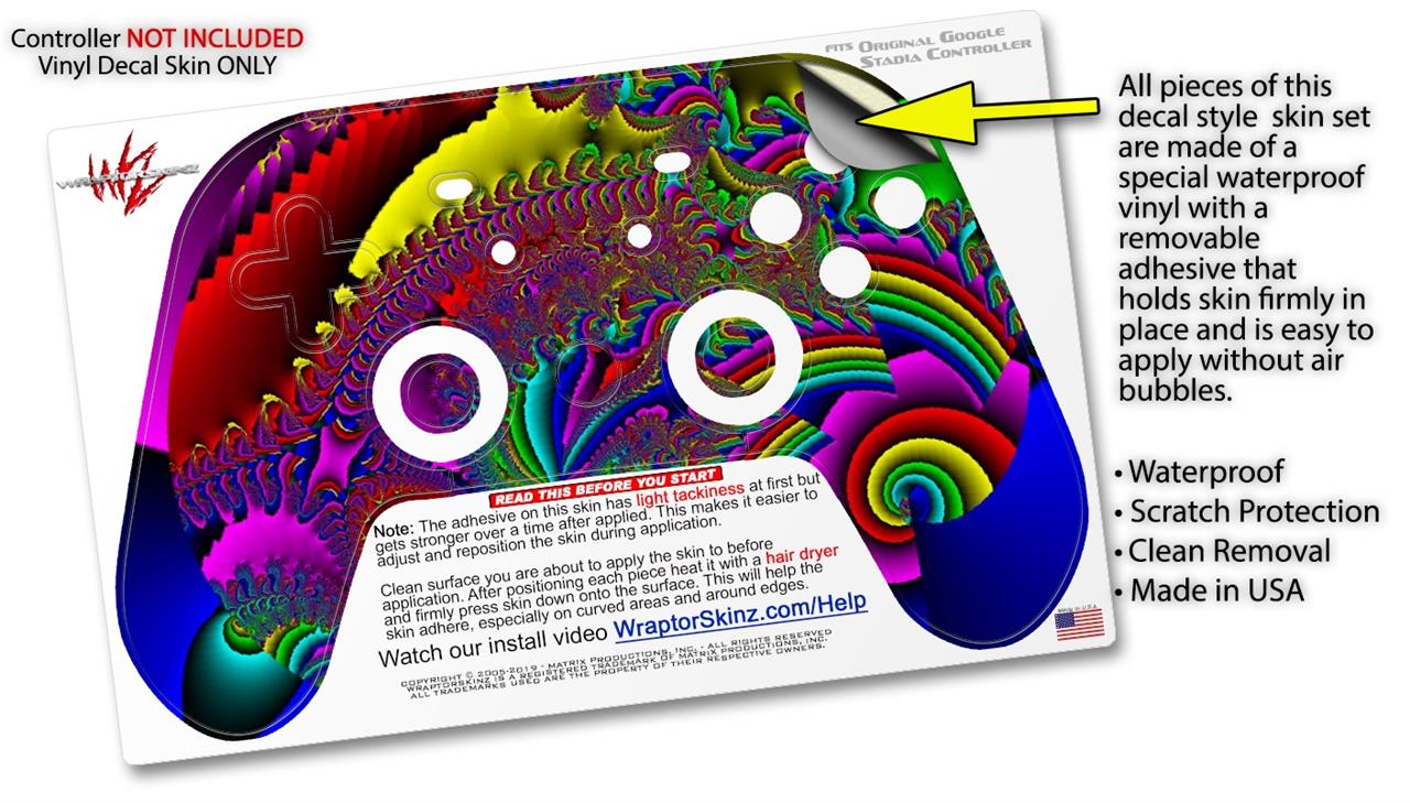 This product is in no way affiliated with or endorsed by Google. WraptorSkinz® skin wraps work with the Original Google Stadia version 1 Controller. Printed using superb photo quality designs and vibrant colors printed with special fade resistant inks that last even in direct sun for years. WraptorSkinz are a composite of two layers of commercial grade materials. The bottom layer is a soft, flexible vinyl with a special removable adhesive that is easily positioned, applied without air bubbles. Next, we print the bottom layer with UV protected, fade resistant inks that deliver superb photo quality designs in vibrant colors. Finally, we bond a professional grade laminate over the entire skin adding a glossy protective finish.
