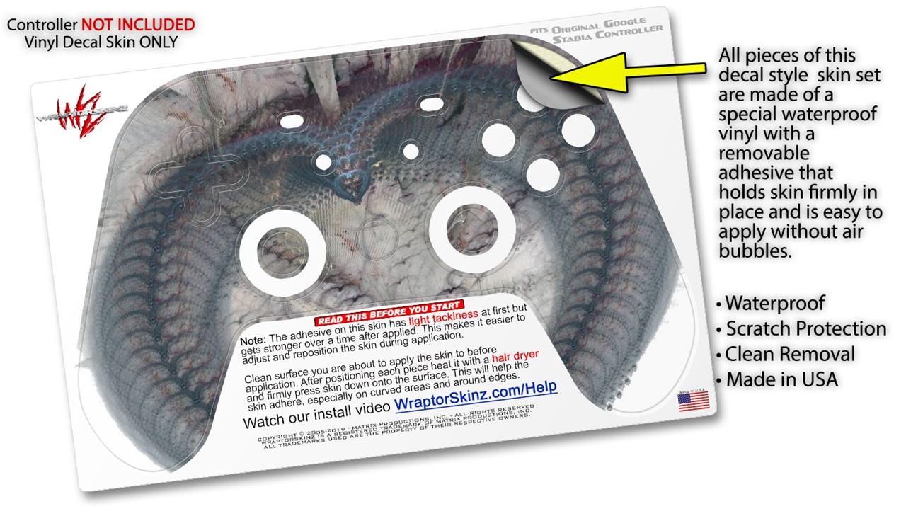 This product is in no way affiliated with or endorsed by Google. WraptorSkinz® skin wraps work with the Original Google Stadia version 1 Controller. Printed using superb photo quality designs and vibrant colors printed with special fade resistant inks that last even in direct sun for years. WraptorSkinz are a composite of two layers of commercial grade materials. The bottom layer is a soft, flexible vinyl with a special removable adhesive that is easily positioned, applied without air bubbles. Next, we print the bottom layer with UV protected, fade resistant inks that deliver superb photo quality designs in vibrant colors. Finally, we bond a professional grade laminate over the entire skin adding a glossy protective finish.