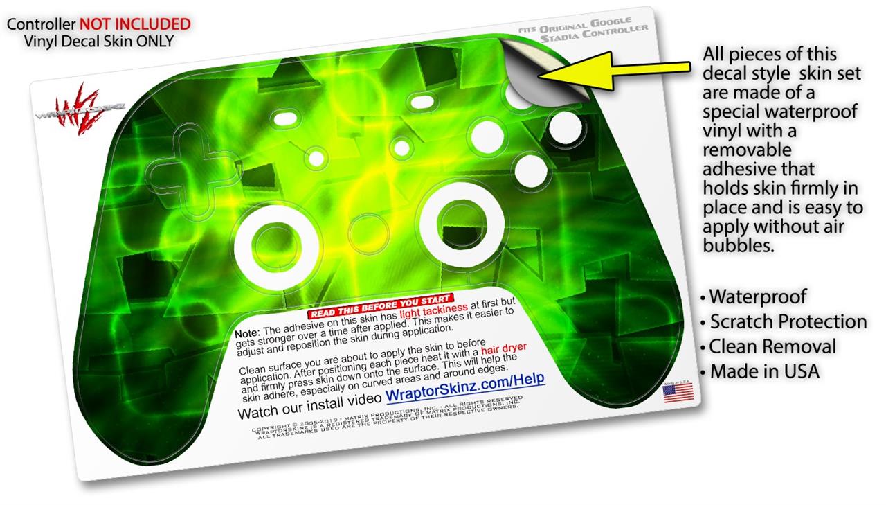 This product is in no way affiliated with or endorsed by Google. WraptorSkinz® skin wraps work with the Original Google Stadia version 1 Controller. Printed using superb photo quality designs and vibrant colors printed with special fade resistant inks that last even in direct sun for years. WraptorSkinz are a composite of two layers of commercial grade materials. The bottom layer is a soft, flexible vinyl with a special removable adhesive that is easily positioned, applied without air bubbles. Next, we print the bottom layer with UV protected, fade resistant inks that deliver superb photo quality designs in vibrant colors. Finally, we bond a professional grade laminate over the entire skin adding a glossy protective finish.