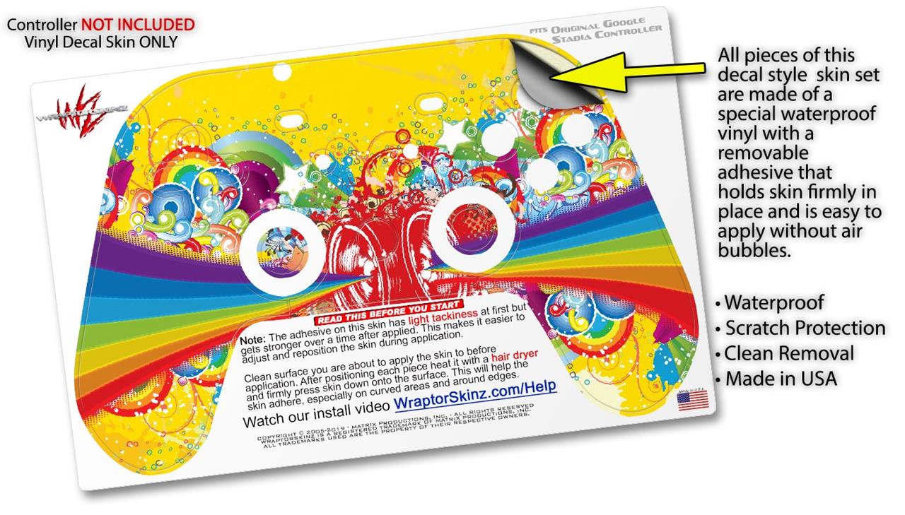 This product is in no way affiliated with or endorsed by Google. WraptorSkinz® skin wraps work with the Original Google Stadia version 1 Controller. Printed using superb photo quality designs and vibrant colors printed with special fade resistant inks that last even in direct sun for years. WraptorSkinz are a composite of two layers of commercial grade materials. The bottom layer is a soft, flexible vinyl with a special removable adhesive that is easily positioned, applied without air bubbles. Next, we print the bottom layer with UV protected, fade resistant inks that deliver superb photo quality designs in vibrant colors. Finally, we bond a professional grade laminate over the entire skin adding a glossy protective finish.