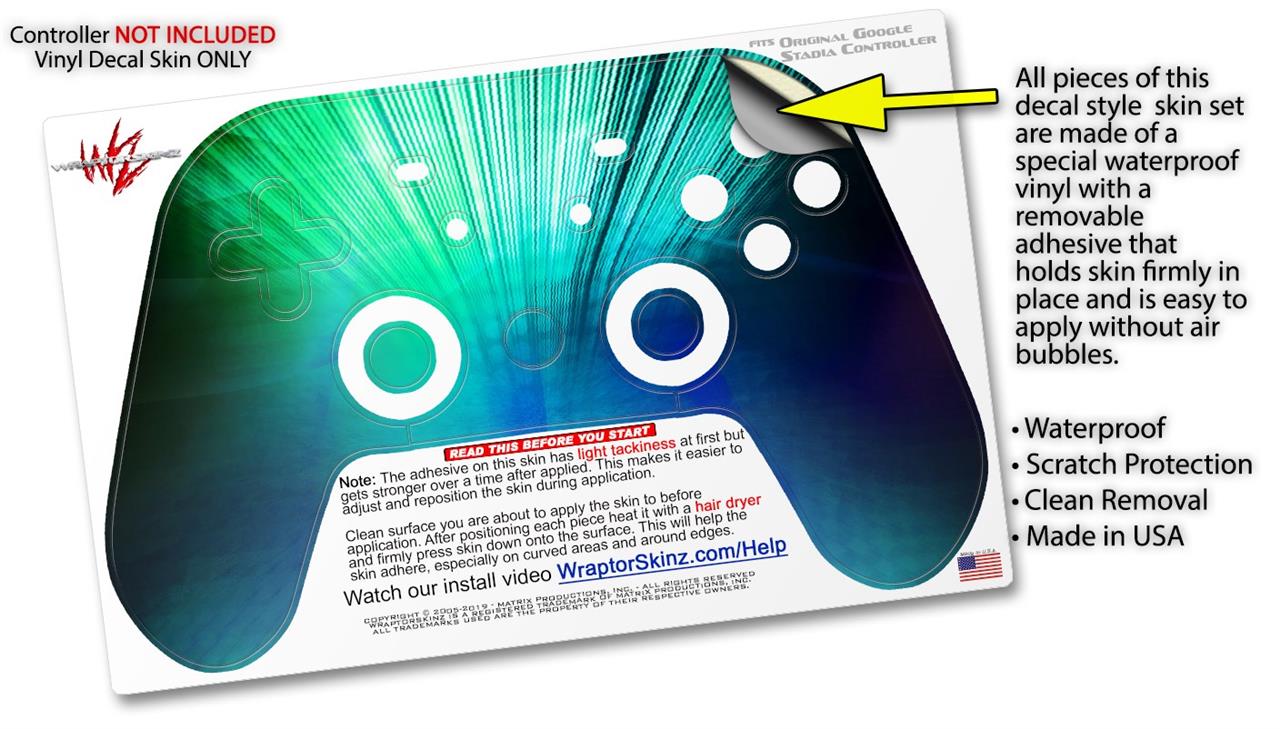 This product is in no way affiliated with or endorsed by Google. WraptorSkinz® skin wraps work with the Original Google Stadia version 1 Controller. Printed using superb photo quality designs and vibrant colors printed with special fade resistant inks that last even in direct sun for years. WraptorSkinz are a composite of two layers of commercial grade materials. The bottom layer is a soft, flexible vinyl with a special removable adhesive that is easily positioned, applied without air bubbles. Next, we print the bottom layer with UV protected, fade resistant inks that deliver superb photo quality designs in vibrant colors. Finally, we bond a professional grade laminate over the entire skin adding a glossy protective finish.