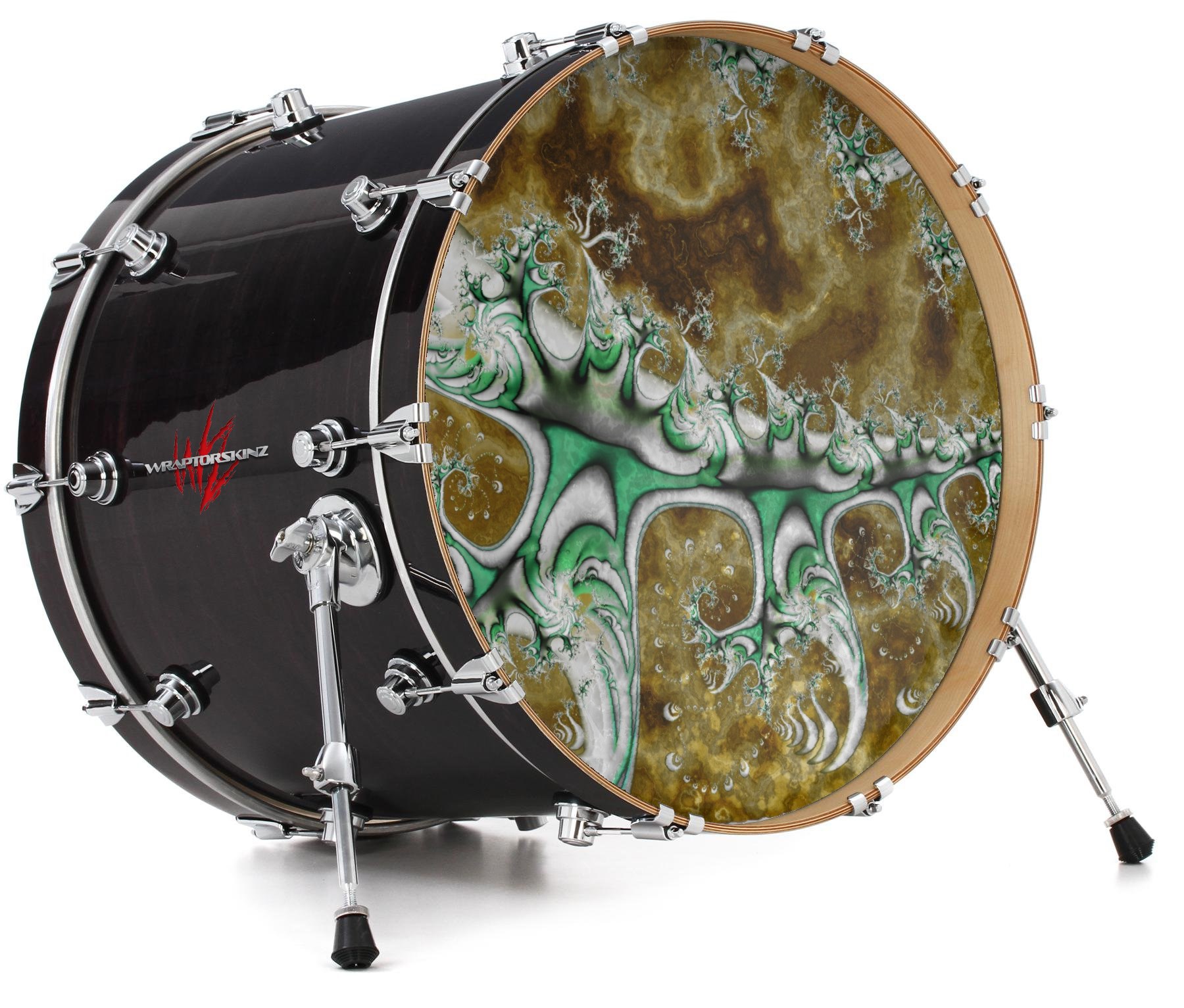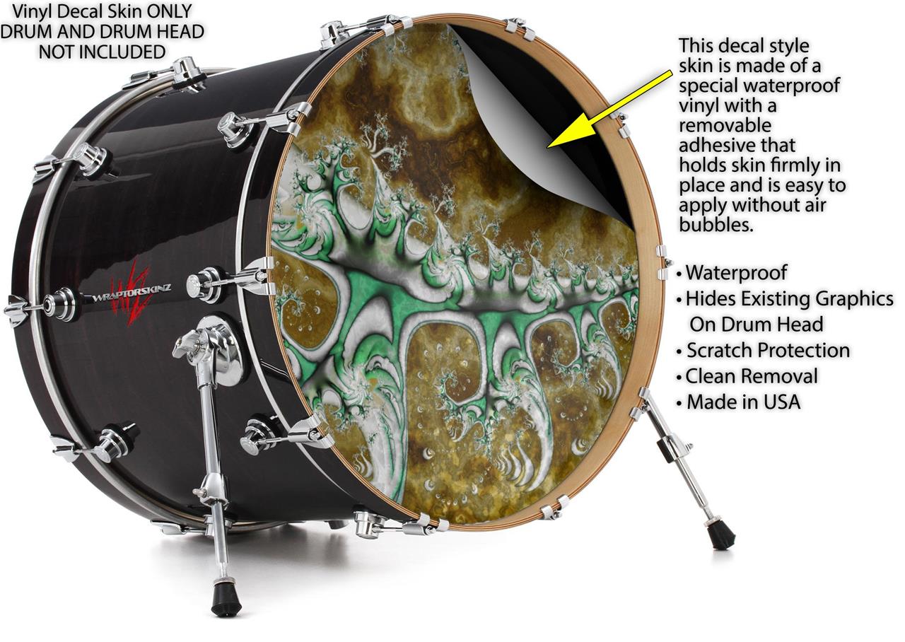 This design also available in other sizes. WraptorSkinz® skin wraps compatible with most kick drum heads. Printed using superb photo quality designs and vibrant colors printed with special fade resistant inks that last even in direct sun for years. WraptorSkinz are a composite three layer commercial grade materials vinyl. The bottom layer is a air release, grey block out removable adhesive that hides existing graphics on the drum head and is easily applied without air bubbles. The middle layer is a flexible vinyl printed with UV protected, fade resistant inks that deliver superb photo quality designs in vibrant colors. Finally, we bond a professional grade laminate over the entire skin adding a glossy protective finish.
