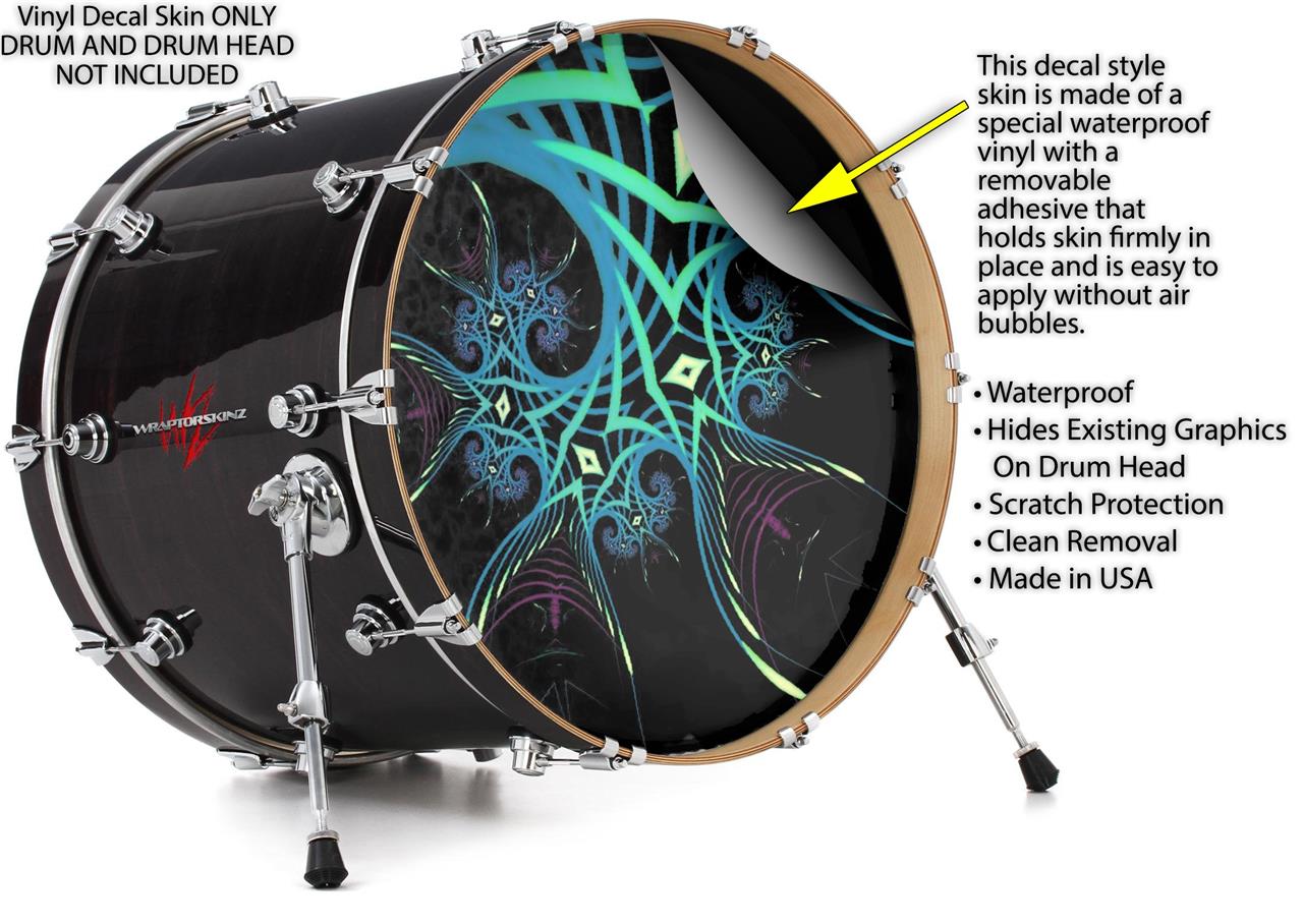 This design also available in other sizes. WraptorSkinz® skin wraps compatible with most kick drum heads. Printed using superb photo quality designs and vibrant colors printed with special fade resistant inks that last even in direct sun for years. WraptorSkinz are a composite three layer commercial grade materials vinyl. The bottom layer is a air release, grey block out removable adhesive that hides existing graphics on the drum head and is easily applied without air bubbles. The middle layer is a flexible vinyl printed with UV protected, fade resistant inks that deliver superb photo quality designs in vibrant colors. Finally, we bond a professional grade laminate over the entire skin adding a glossy protective finish.
