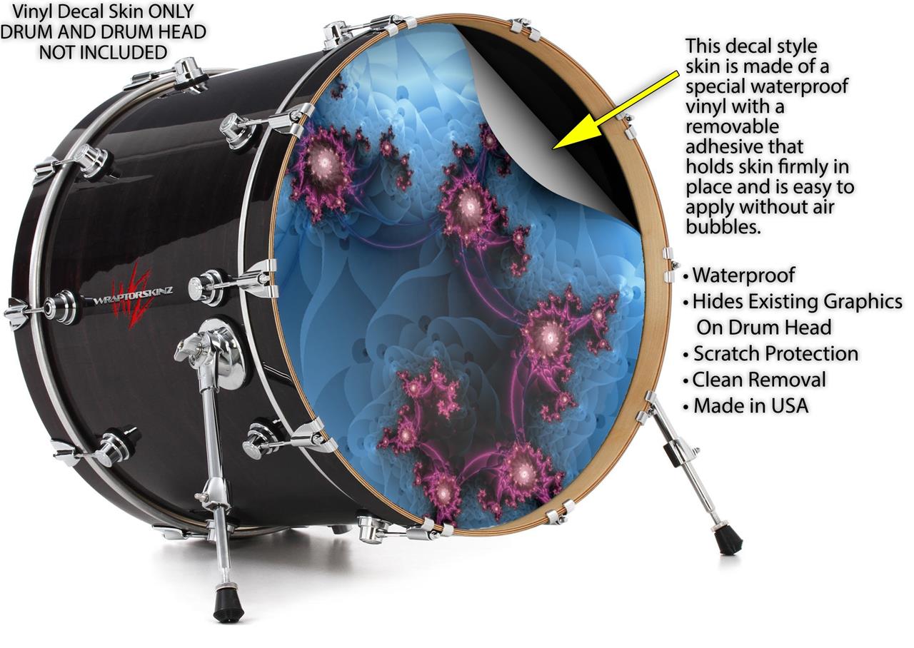This design also available in other sizes. WraptorSkinz® skin wraps compatible with most kick drum heads. Printed using superb photo quality designs and vibrant colors printed with special fade resistant inks that last even in direct sun for years. WraptorSkinz are a composite three layer commercial grade materials vinyl. The bottom layer is a air release, grey block out removable adhesive that hides existing graphics on the drum head and is easily applied without air bubbles. The middle layer is a flexible vinyl printed with UV protected, fade resistant inks that deliver superb photo quality designs in vibrant colors. Finally, we bond a professional grade laminate over the entire skin adding a glossy protective finish.
