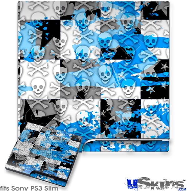 Decal Skin compatible with Sony PS3 Slim Checker Skull Splatter Blue