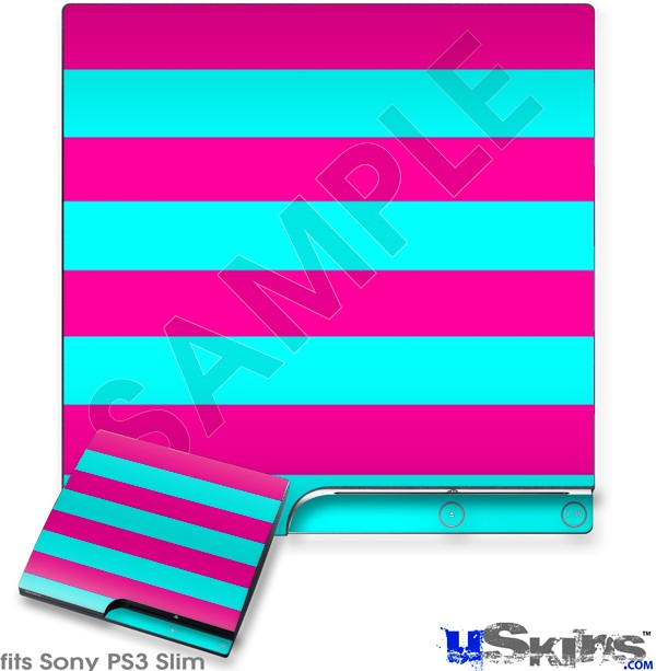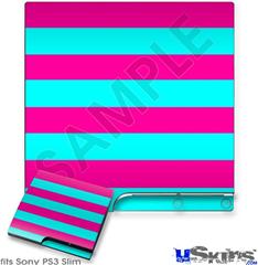 Decal Skin compatible with Sony PS3 Slim Psycho Stripes Neon Teal and Hot Pink