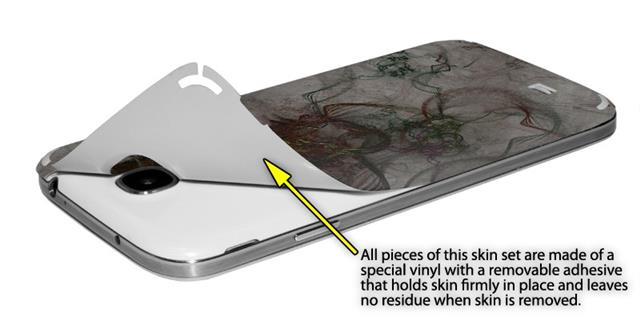 • Decal style vinyl skin covers front and back of Samsung Galaxy S4 phone.