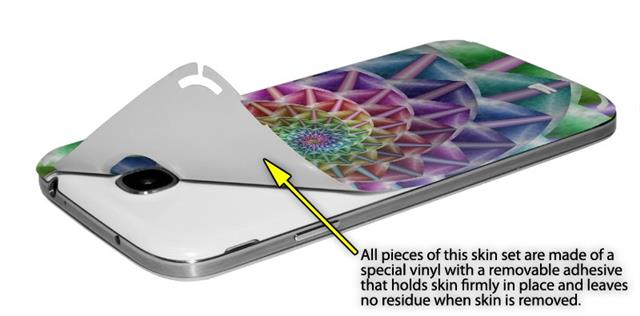 • Decal style vinyl skin covers front and back of Samsung Galaxy S4 phone.