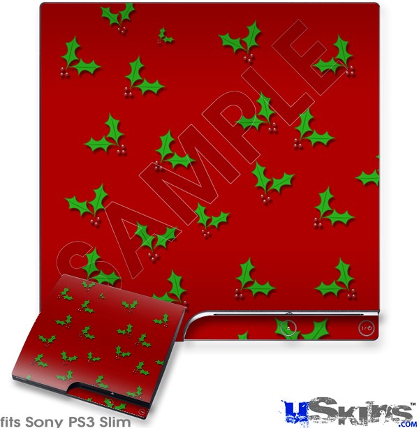 Decal Skin compatible with Sony PS3 Slim Holly Leaves on Red