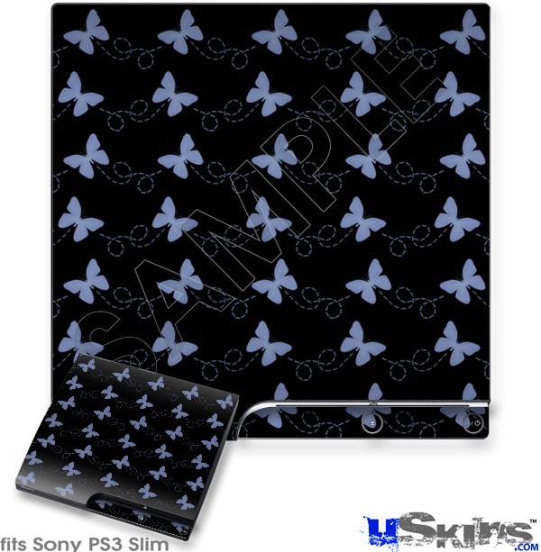 Decal Skin compatible with Sony PS3 Slim Pastel Butterflies Blue on Black