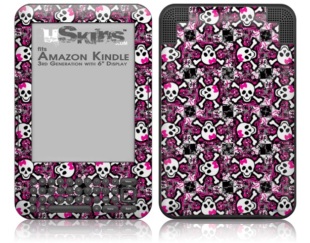 Splatter Girly Skull Pink - Decal Style Skin fits Amazon Kindle 3 Keyboard (with 6 inch display)