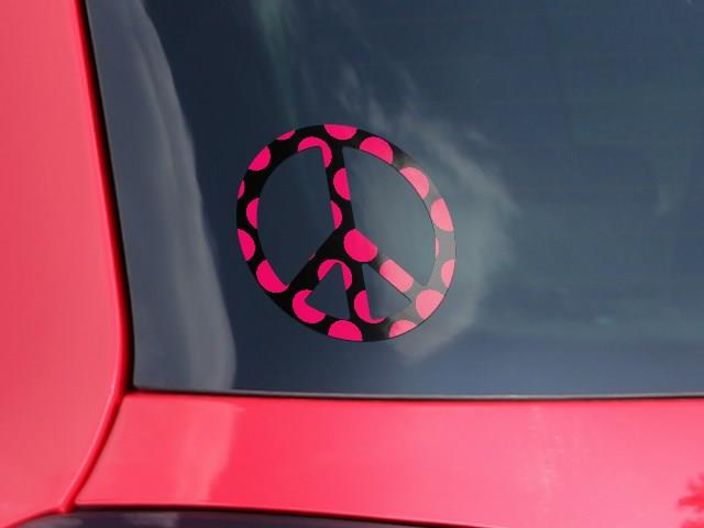 Kearas Polka Dots Pink On Black - Peace Sign Car Window Decal 6 x 6 inches