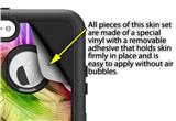 uSkins™ are self adhering vinyl decal style skins and are a great way to add a new look to your existing protective case. uSkins are a composite of two layers of commercial grade materials. The bottom layer is a soft, flexible vinyl with a special removable adhesive that is easily positioned, applied without air bubbles. Next we print the bottom layer with UV protected, fade resistant inks that deliver superb photo quality designs in vibrant colors. Finally we bond a professional grade laminate over the entire skin adding a glossy protective finish.
