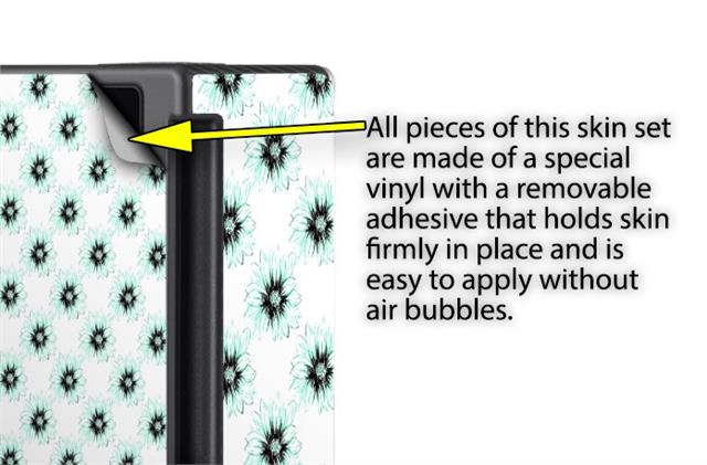 WraptoSkinz™ skins are superb photo quality designs and vibrant colors printed with special Eco-Friendly, fade resistant inks. Our skins are self-adhering flexible vinyl skins that helps prevent scratches. Made of composite, multi-layered commercial grade materials. The bottom layer is made with a special removable adhesive that is easily positioned and applied without air bubbles. We print your design on the bottom layer then bond a professional grade laminate over the entire skin adding a glossy protective finish.