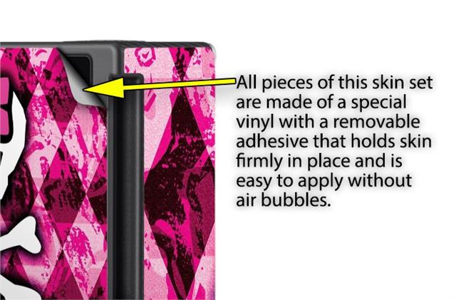 WraptoSkinz™ skins are superb photo quality designs and vibrant colors printed with special Eco-Friendly, fade resistant inks. Our skins are self-adhering flexible vinyl skins that helps prevent scratches. Made of composite, multi-layered commercial grade materials. The bottom layer is made with a special removable adhesive that is easily positioned and applied without air bubbles. We print your design on the bottom layer then bond a professional grade laminate over the entire skin adding a glossy protective finish.