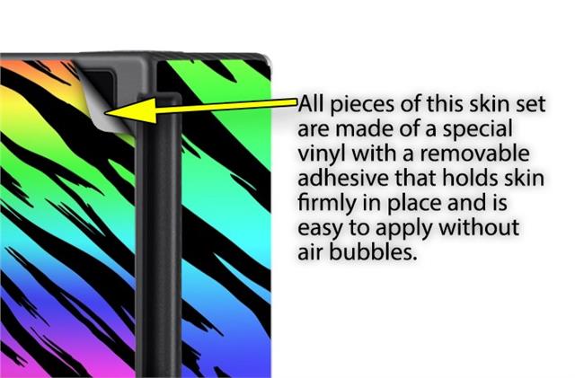 WraptoSkinz™ skins are superb photo quality designs and vibrant colors printed with special Eco-Friendly, fade resistant inks. Our skins are self-adhering flexible vinyl skins that helps prevent scratches. Made of composite, multi-layered commercial grade materials. The bottom layer is made with a special removable adhesive that is easily positioned and applied without air bubbles. We print your design on the bottom layer then bond a professional grade laminate over the entire skin adding a glossy protective finish.