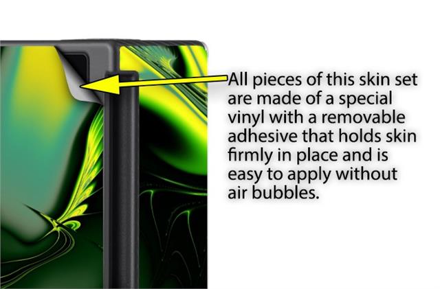 WraptoSkinz™ skins are superb photo quality designs and vibrant colors printed with special Eco-Friendly, fade resistant inks. Our skins are self-adhering flexible vinyl skins that helps prevent scratches. Made of composite, multi-layered commercial grade materials. The bottom layer is made with a special removable adhesive that is easily positioned and applied without air bubbles. We print your design on the bottom layer then bond a professional grade laminate over the entire skin adding a glossy protective finish.