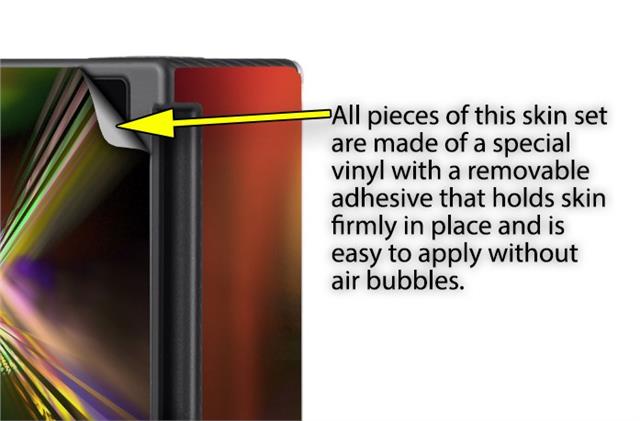 WraptoSkinz™ skins are superb photo quality designs and vibrant colors printed with special Eco-Friendly, fade resistant inks. Our skins are self-adhering flexible vinyl skins that helps prevent scratches. Made of composite, multi-layered commercial grade materials. The bottom layer is made with a special removable adhesive that is easily positioned and applied without air bubbles. We print your design on the bottom layer then bond a professional grade laminate over the entire skin adding a glossy protective finish.