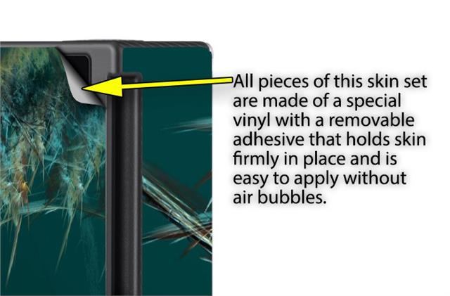 WraptoSkinz™ skins are superb photo quality designs and vibrant colors printed with special Eco-Friendly, fade resistant inks. Our skins are self-adhering flexible vinyl skins that helps prevent scratches. Made of composite, multi-layered commercial grade materials. The bottom layer is made with a special removable adhesive that is easily positioned and applied without air bubbles. We print your design on the bottom layer then bond a professional grade laminate over the entire skin adding a glossy protective finish.