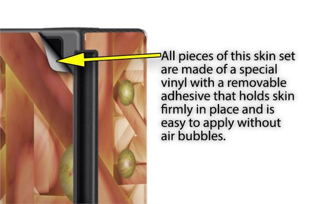 WraptoSkinz™ skins are superb photo quality designs and vibrant colors printed with special Eco-Friendly, fade resistant inks. Our skins are self-adhering flexible vinyl skins that helps prevent scratches. Made of composite, multi-layered commercial grade materials. The bottom layer is made with a special removable adhesive that is easily positioned and applied without air bubbles. We print your design on the bottom layer then bond a professional grade laminate over the entire skin adding a glossy protective finish.