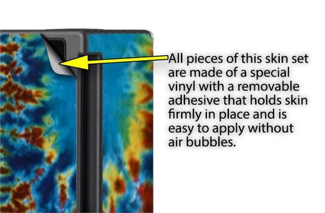 WraptoSkinz™ skins are superb photo quality designs and vibrant colors printed with special Eco-Friendly, fade resistant inks. Our skins are self-adhering flexible vinyl skins that helps prevent scratches. Made of composite, multi-layered commercial grade materials. The bottom layer is made with a special removable adhesive that is easily positioned and applied without air bubbles. We print your design on the bottom layer then bond a professional grade laminate over the entire skin adding a glossy protective finish.