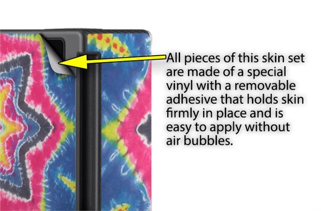 WraptoSkinz™ skins are superb photo quality designs and vibrant colors printed with special Eco-Friendly, fade resistant inks. Our skins are self-adhering flexible vinyl skins that helps prevent scratches. Made of composite, multi-layered commercial grade materials. The bottom layer is made with a special removable adhesive that is easily positioned and applied without air bubbles. We print your design on the bottom layer then bond a professional grade laminate over the entire skin adding a glossy protective finish.