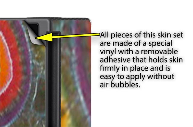 WraptoSkinz™ skins are superb photo quality designs and vibrant colors printed with special Eco-Friendly, fade resistant inks. Our skins are self-adhering flexible vinyl skins that helps prevent scratches. Made of composite, multi-layered commercial grade materials. The bottom layer is made with a special removable adhesive that is easily positioned and applied without air bubbles. We print your design on the bottom layer then bond a professional grade laminate over the entire skin adding a glossy protective finish.