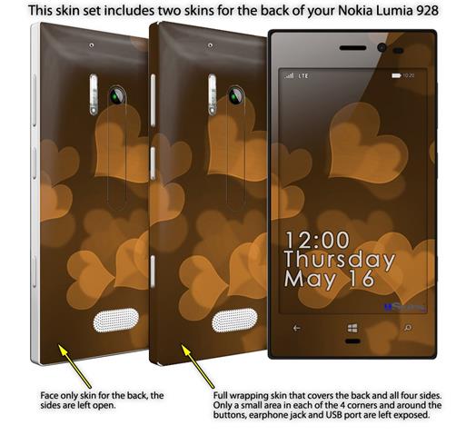 • Decal style vinyl skin covers front, back and side of Nokia Lumia 928 phone.